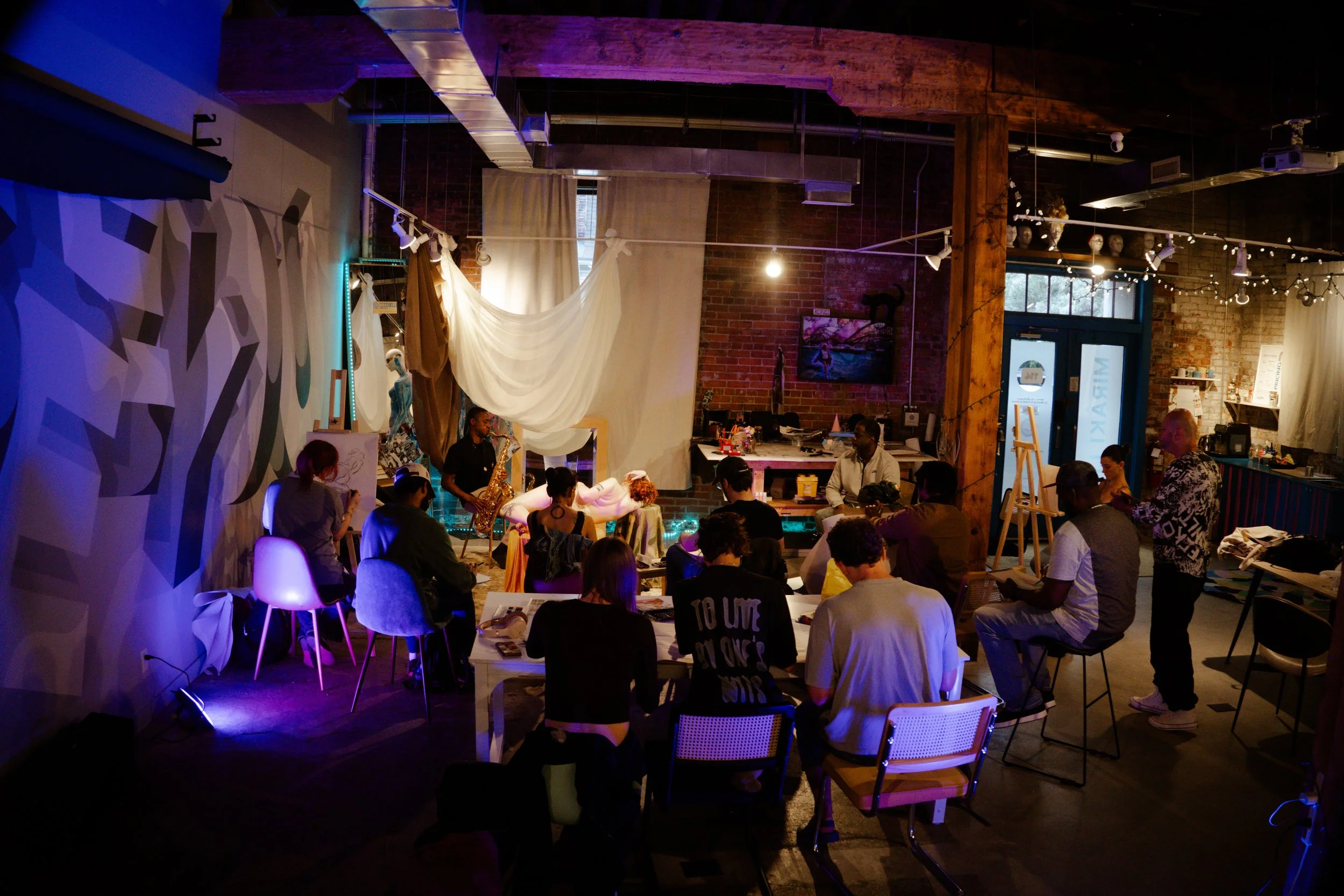 Adding another layer to the ambiance, live music accompanies the sessions, enhancing the energy in the room and inspiring rhythm, emotion, and spontaneity in each artist’s mark-making. The result is an immersive, multisensory experience that celebrates the beauty of the human form, the power of community, and the evolving dialogue between art and self-expression.